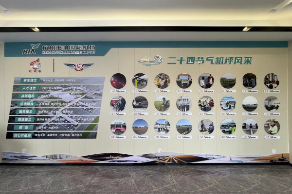 此次改造主要涉及安全宣傳和設(shè)備配置兩個方面。安全宣傳方面,飛行區(qū)中心全面更新了文化墻,以“24節(jié)氣”為主題,通過24張圖片結(jié)合24個節(jié)氣展示不同時期下的機(jī)坪運行特點及安全風(fēng)險,拼成一條“時間走廊”。從夏季的防臺防汛到冬季的除冰雪,從春季的鳥類遷徙到秋季的低能見度運行,從春運到暑運,從高溫防暑到低溫保暖,實現(xiàn)安全教育的可視化場景滲透。